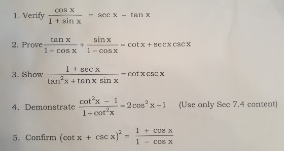 Solved Cos X 1 Verify Secx Tanx 1 Sin X Sinx Cot X Chegg Com