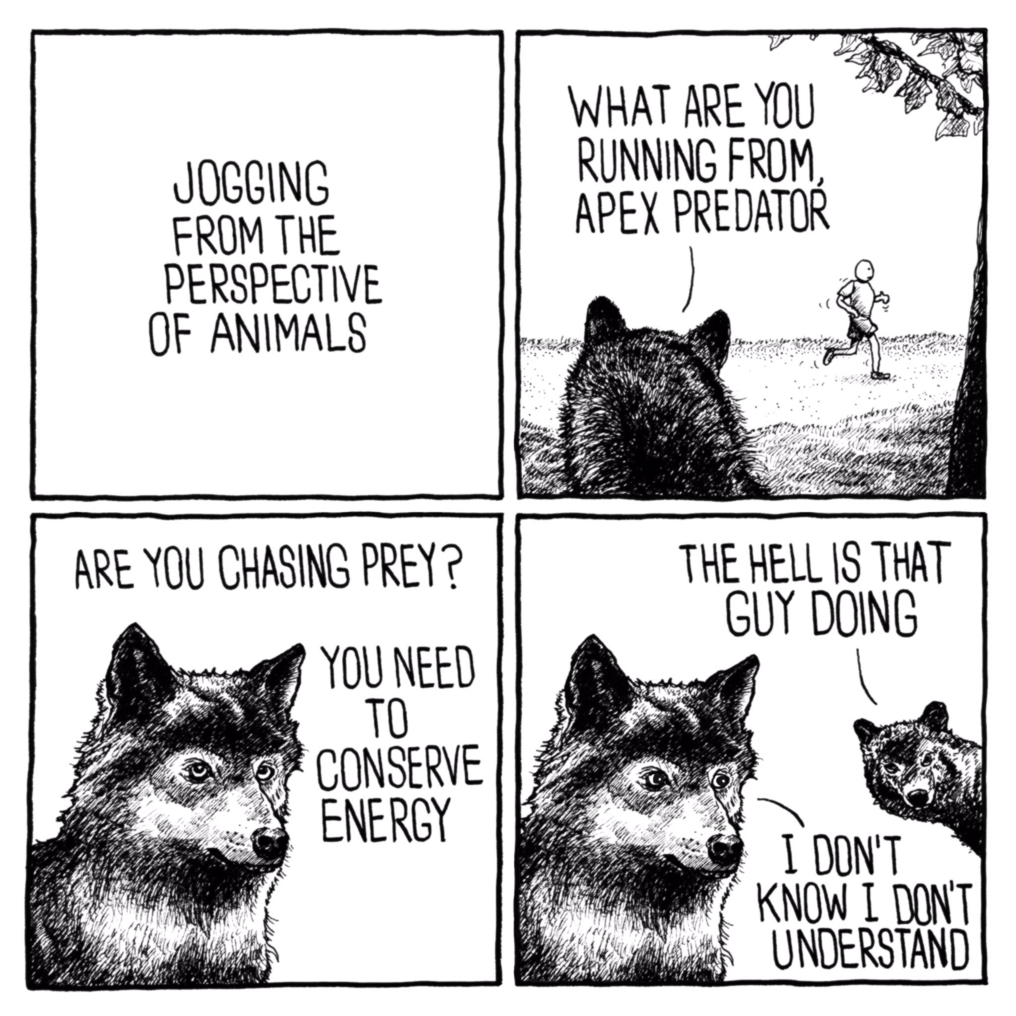 What Are You Running From Apex Predator Jogging From The Perspective Of Animals The Hell Is That Guy Doing Are You Chasing Prey You Need To Conserve Energy I Don T Know I
